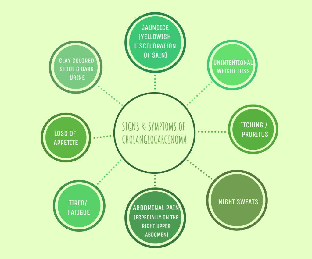 Symptoms associated with bile duct cancer are usually due to the cancer blocking the bile duct drainage. Most of the time Signs and symptoms do not appear until the cancer is advanced or big enough to cause a blockage. Early signs and symptoms are nonspecific and usually most people miss to notice it. If you experience any symptoms mentioned below, let your doctor know no matter how small the symptom is.
